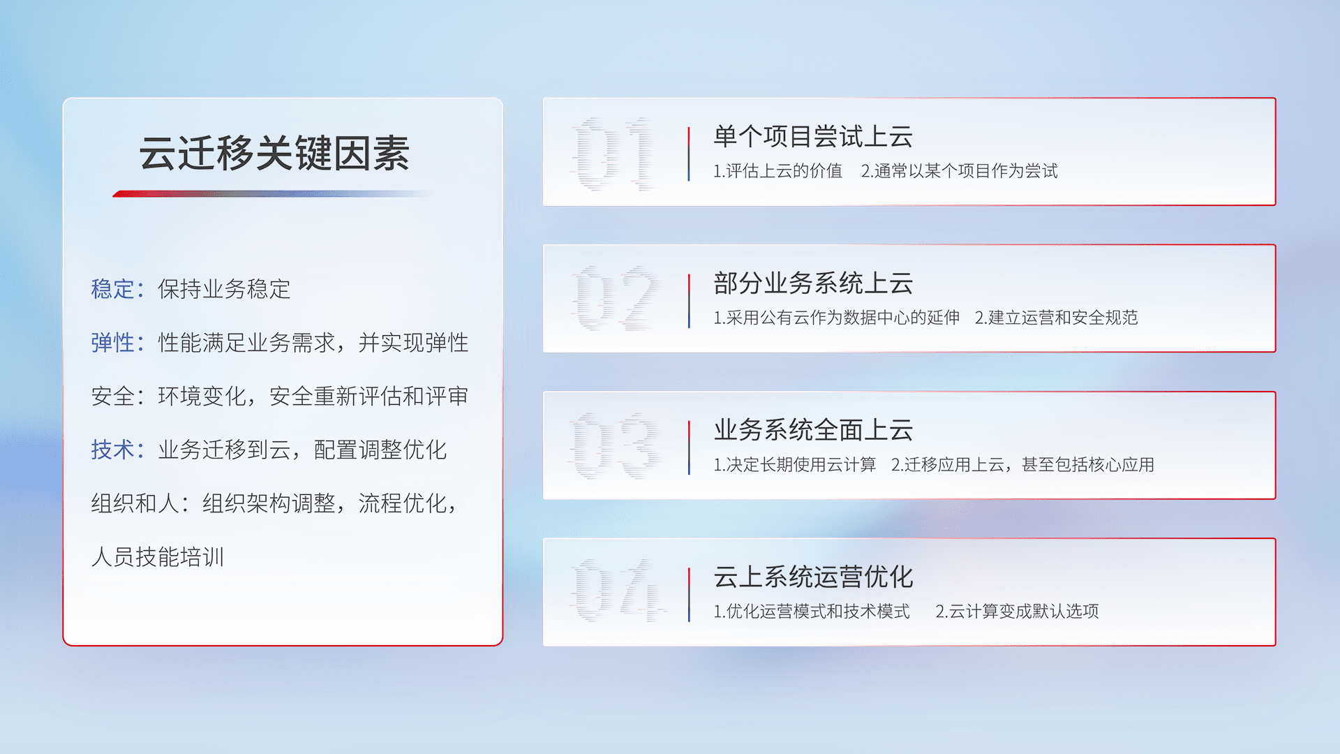 结合实际业务,,,,从规划设计、、、云平台选型、、云原生改造、、、数据迁移、、、集成交付,,,迁移全过程为客户识别最佳上云路径,,,做好风险识别管理,,,,设计网络架构、、、、身份权限、、安全审计合规、、、操作审计、、、、日志审计、、监控告警策略、、多站点容灾设计等,,,,对云上基础设施进行整体规划,,,,提升IT治理水平,,,,以满足弹性、、、高可用、、、高性能的需求。。。。